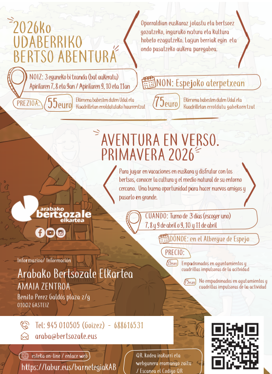 Azken urteetan bezala, Pazko asteko oporraldian euskaraz jolastu eta bertsoez gozatzeko, inguruko natura eta kultura hobeto ezagutzeko helburuarekin Udaberriko Bertso Abentura burutuko da. Arabako haur eta gaztetxoek norbere herritik gertuko lagun berriak egin, bertso munduan murgildu eta ondo pasatzeko aukera paregabea izango dute. Lautada eta Gorbeialdeko Kuadrillekin eta Laudio, Amurrio, Aiara, Artziniega, Urduña eta Oiongo Udalekin elkarlanean antolatu dira bi egonaldiak.