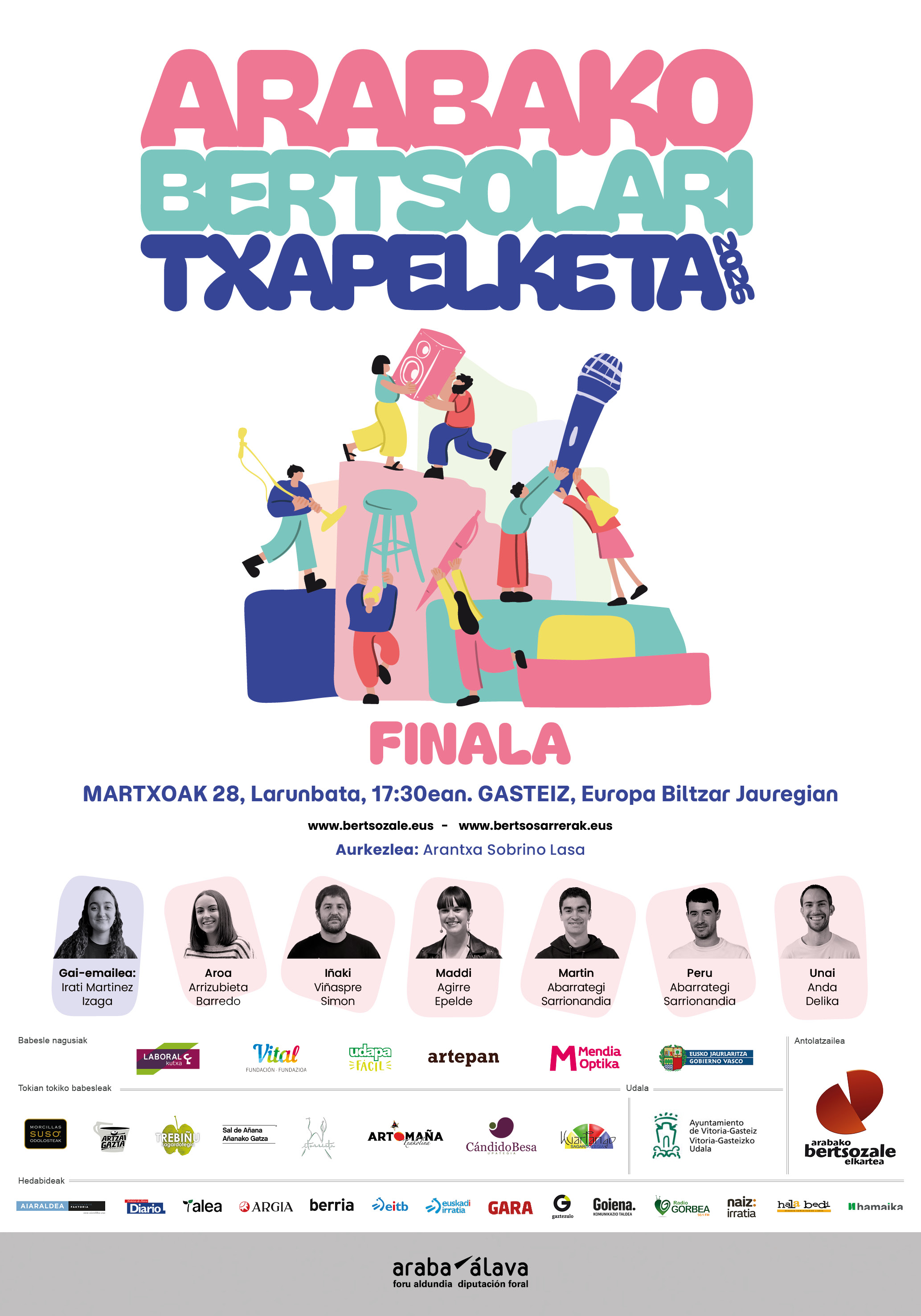Finalaren aurkezpena Biltzar Jauregian bertan egin du Arabako Bertsozale Elkarteak. Uxue Diaz de Ceriok aurkeztu ditu sei protagonistak bertan direla: