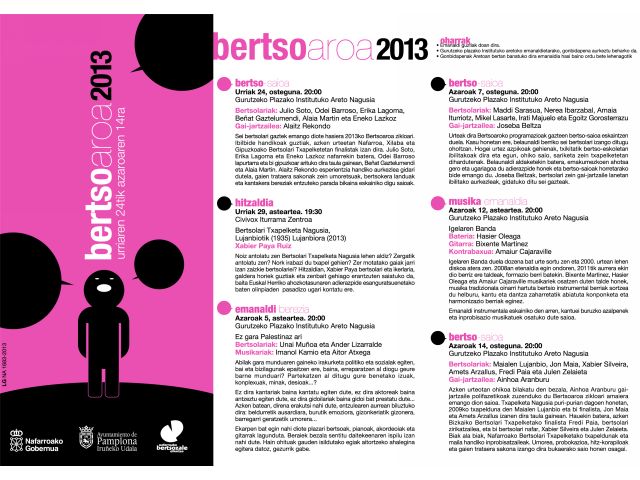 Urriaren 24an emango zaio hasiera bertso saio batekin. Goi mailako sei bertsolari gazte izango dira oholtza gainean: Julio Soto, Beñat Gaztelumendi, Erika Lagoma, Eneko Lazkoz, Alaia Martin eta Odei Barroso. Gai-jartzaile lanetan berriz, Alaitz Rekondo nafarra.
