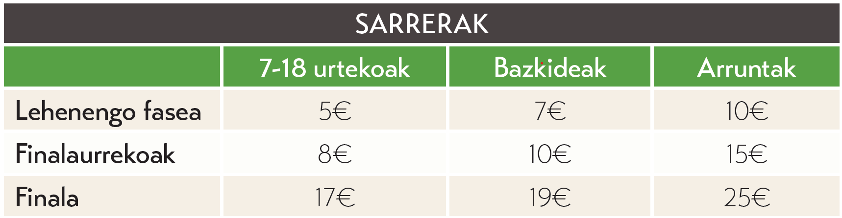 - Aurresalmenta bidezko sarrerak bukatzen ez badira, leihatilan ere salduko dira sarrerak saioen egunean bertan, 16:00etatik aurrera (15:00etatik aurrera finalaren kasuan).